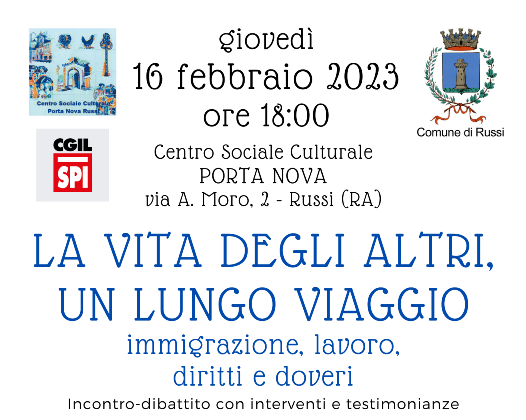 Giovedì 16 febbraio 2023, alle ore 18, presso il Centro Sociale Culturale Porta Nova di via Aldo Moro 2 Russi (RA) si terrà un incontro-dibattito dal titolo “La vita degli altri, un lungo viaggio - Immigrazione, lavoro, diritti e doveri” organizzato con una collaborazione tra Comune di Russi, Centro Sociale Porta Nova e SPI CGIL Russi.