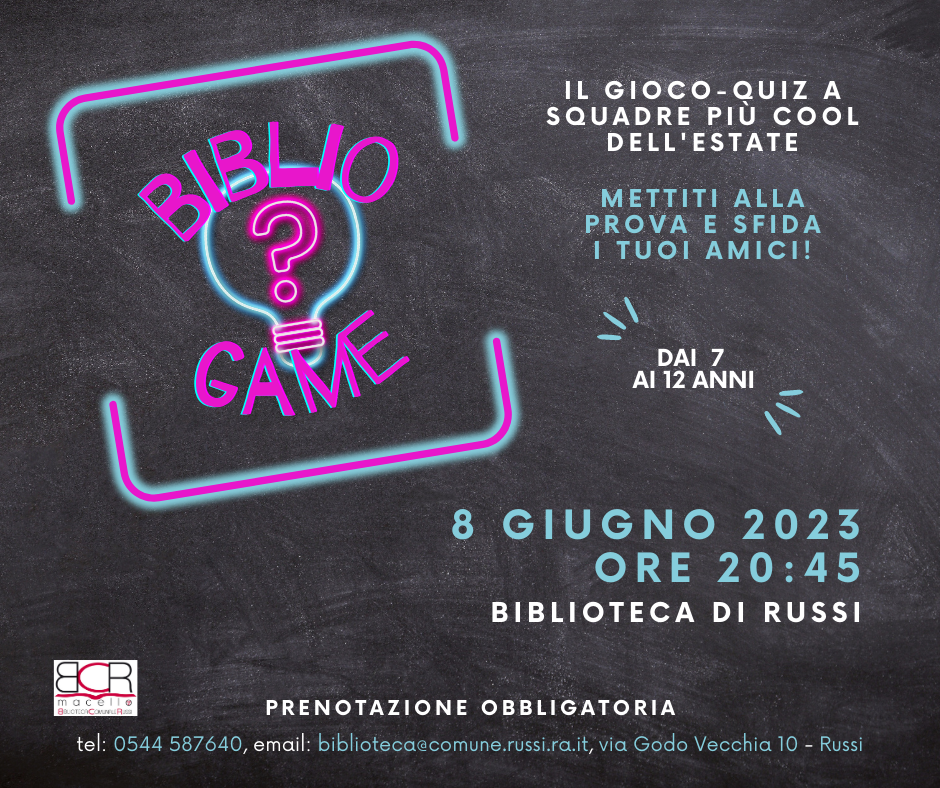 Giovedì 8 giugno, a partire dalle 20.45, presso la Biblioteca Comunale di Russi, in via Godo vecchia 10, bambini e ragazzi tra i 7 e i 12 anni potranno mettersi alla prova e sfidare i propri amici partecipando a Bibliogame, il gioco-quiz a squadre a tema libri e film.