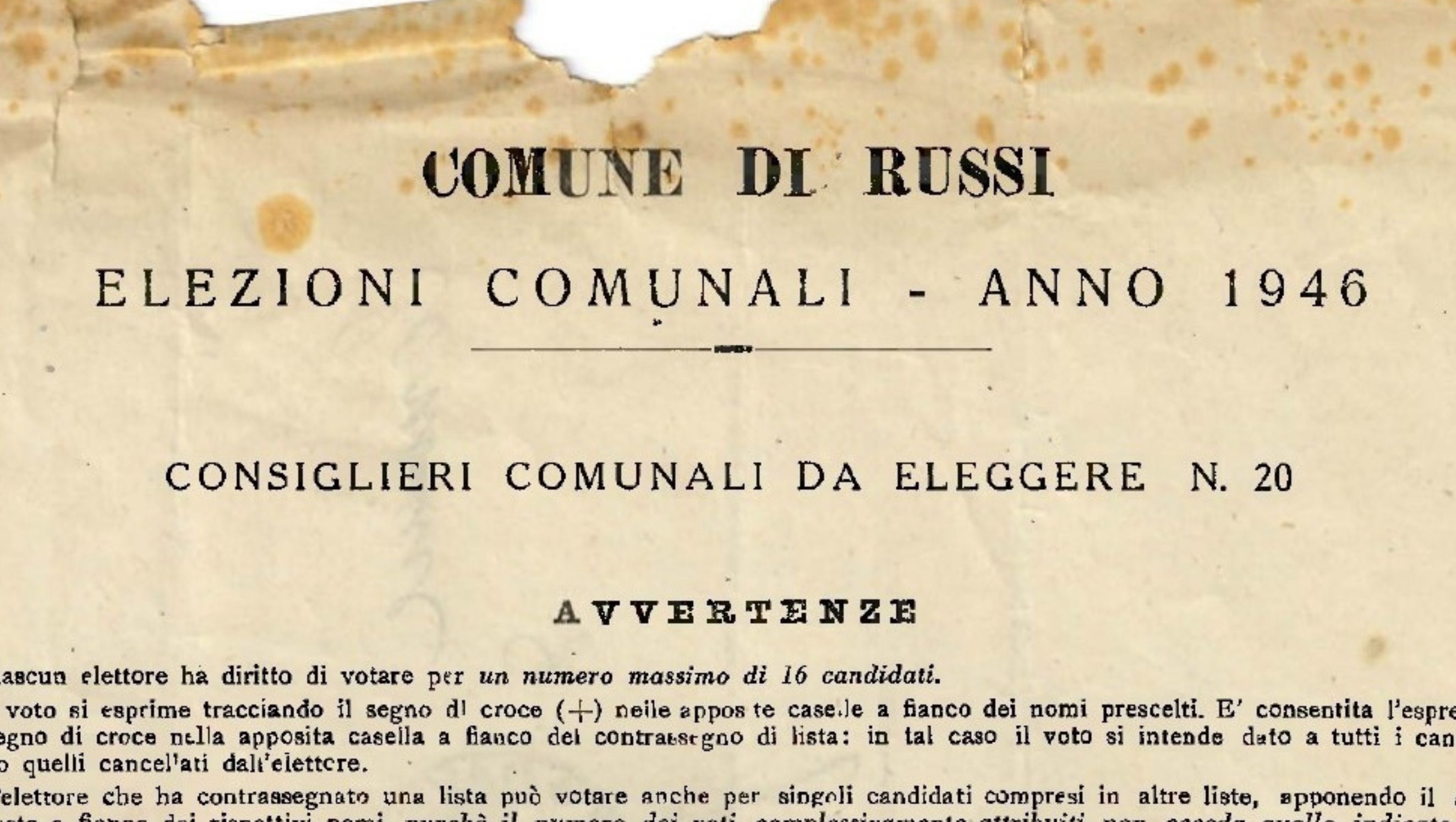 "plaintext": "Il 24 marzo 1946 il Comune di Russi tornava alle urne per le elezioni amministrative. Dopo vent\u2019anni di dittatura e quasi due anni di sanguinosa occupazione nazifascista, i cittadini poterono scegliere i rappresentanti in seno al Consiglio comunale. Ma non era l\u2019unica novit\u00e0. Per la prima volta in Italia si votava a suffragio universale: uomini e donne, senza distinzione di ceto, erano chiamati a esercitare un diritto democratico fondamentale.",