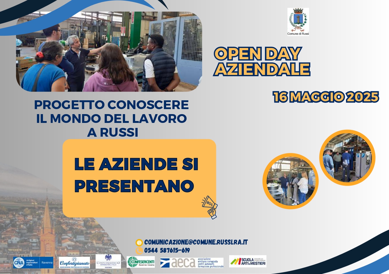 "plaintext": "L'OPEN DAY delle aziende si inserisce nel progetto\u00a0comunale Conoscere il mondo del lavoro a Russi , il cui obiettivo \u00e8 avvicinare i giovani alle imprese del territorio, generare nuove occasioni d'impiego, migliorare l'incontro tra domanda e offerta di lavoro. \n\nDal 2023 l'Amministrazione comunale ha strutturato una serie di attivit\u00e0 concrete, coinvolgendo numerosi partner con cui condividere la visione progettuale, gli obiettivi e la strategia d'insieme. \nTale rete comprende\u00a0le aziende del territorio,\u00a0le Associazioni di categoria (CNA, Confcommercio, Confartigianato e Confesercenti), AECA (Associazione Emiliano Romagnola di enti autonomi di formazione professionale), Scuola Arti e Mestieri\u00a0Angelo Pescarini e\u00a0l\u2019Istituto Comprensivo Baccarini di Russi.",